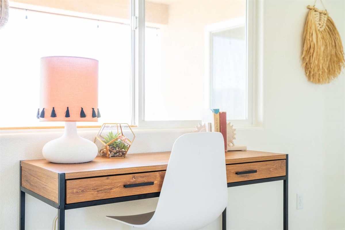 Enjoy a private pool and a spacious hot tub, perfect for relaxing after a day of hiking, stargazing, or exploring the high desert. The light-filled living room features boho décor, a sectional sofa that converts to a queen bed, a 55” Smart TV, and a cozy digital fireplace. A fully updated kitchen with stainless steel appliances, granite counters, and dining for eight makes gathering effortless.